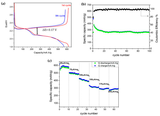 Upon evaluating the specific capacity at different current rates, as expected, it can be seen (Figure 5c) that when the current density increases, the specific capacity diminish. Nevertheless, it is important to note that even at high current densities of 200 uA/mgS, it still remains with a good specific capacity of around 300 mAh/g.