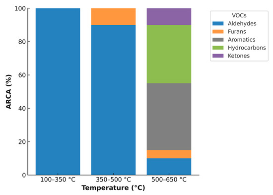 In the presence of phosphoric acid as an activator (Figure 7), acetic acid emissions are observed mainly between 100 and 500 °C, with a percentage between 30 and 45%. Emissions of this acid are considerable, as acetic acid contributes notably to the acidity of precipitation and cloud water in the troposphere [57,58,59,60,61]. Keene and Galloway [62] and Andreae et al. [63] suggested that carboxylic acids may contribute up to 80–90% of the acidity in precipitation in remote areas of the world. Due to their hygroscopic properties and capacity to function as cloud condensation nuclei [64], they play a role in absorbing and scattering solar radiation, thereby influencing the global thermal balance.
