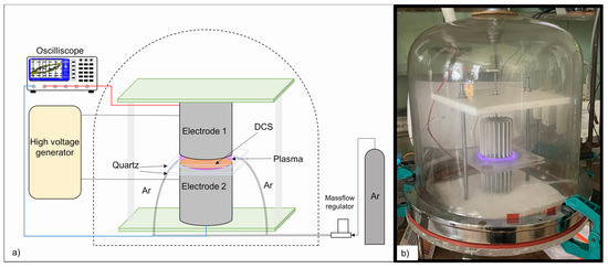 The reactor consisted of two parallel electrodes (steel plates) made of stainless steel with a diameter of 50 mm. Two quartz plates (100 × 100 × 2 mm) placed between the electrodes served as a dielectric barrier. The distance between the plates was 3.5 mm and the discharge gap was 7.5 mm. Cylindrical aluminum radiators 50 mm in diameter and 55 mm high dissipated the generated heat. A 500 mg DCS was placed between quartz plates. Argon from a cylinder (99.9999%, ITC Promekservis, Russia, Moscow) was supplied between the quartz plates using an RRG-20 regulator (Eltochpribor, Russia, Moscow, 2023). The Ar flow rate was 70 mL/min. The whole set-up was placed under a glass dome (Figure 1b) to ensure the Ar flow did not mix with the air. The high voltage power supply generated a sine wave signal with a frequency of 23 kHz. The registration of current and voltage signals, as well as Lissajous curves, was carried out using a TDS 2012B oscilloscope (Tektronix, USA, Beaverton, OR, 2010). Based on the area of the Lissajous curves, the absorbed plasma power was calculated using the following equation: