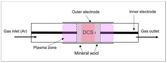 The DCS plasma processing was carried out in a dielectric barrier discharge (DBD) installation with planar electrodes (Figure 1). The configuration of the reactor with planar electrodes was chosen as it is more suitable for the treatment of the solid materials. The DCS powder can be distributed and treated more uniformly on the surface of the plate and thus be more efficiently decomposed. In each experiment, 300 to 500 mg of DCS were placed in the reactor.