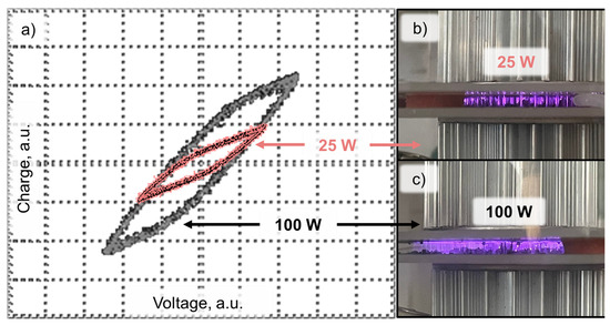 Lissajous curves recorded at different discharge powers (a) and photographs of the discharge at a power of 25 W (b) and 100 W (c).