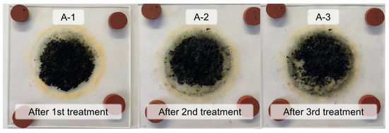 The sample mass decreased to 47 ± 0.2% of the original after mixing the sample and reprocessing (re-treating) for 10 min (A-6 sample). The original sample was processed twice to obtain sample A-6, as in Figure 6.