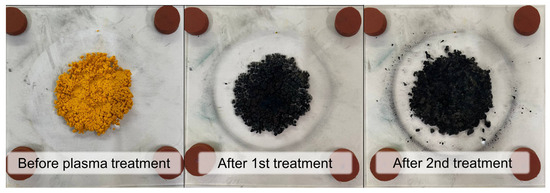 The original orange-colored DCS powder underwent changes after plasma processing (treatment) at a power of 25 W. However, the presence of the original DCS powder on the surface of the lower quartz plate and around the treatment area was visually observed after the first treatment for 10 min, along with the reacting black DCS particles (Figure 4). The obtained mixture was designated as sample A-1 (see Table 1 for the sample designation details). Later, we found that an additional treatment is required to accomplish the DCS decomposition. The amount of the original powder decreased after mixing and treating for a second time (A-2 sample). However, particles of the original DCS powder were present in the product even after the third stage of treatment (A-3 sample). The relative mass of the sample was 61.6 ± 0.4% of the original after the third treatment. The same results were obtained even after increasing the duration of the treatment cycle up to 15 min (A-4 sample). It was then concluded that the input power of 25 W was insufficient to reach the complete decomposition of the parent DCS.