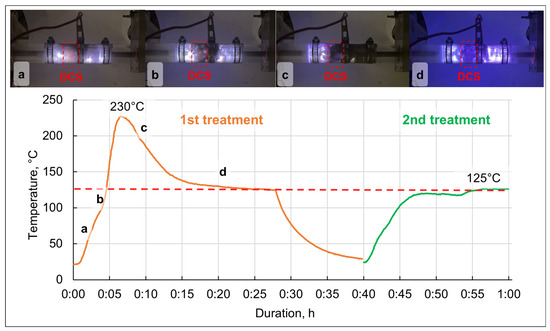 In Figure 7c, no plasma is generated on the right side of the discharge zone. After these gases were eliminated from the discharge zone, only Ar was present in the reactor and the plasma continued to be generated (Figure 7d). Meanwhile, the temperature decreased to the value of ~125 °C and did not increase further. After the reactor was cooled to room temperature, the second treatment was conducted without any additional manipulations with the DCS sample. Figure 7 demonstrates that, just as in the first treatment, the temperature started to increase rapidly to ~125 °C, but that no exothermic effect was observed. Thus, the steady-state reactor temperature during the plasma treatment was approximately 125 °C, with an increase to 230 °C at the DCS exothermic decomposition stage.