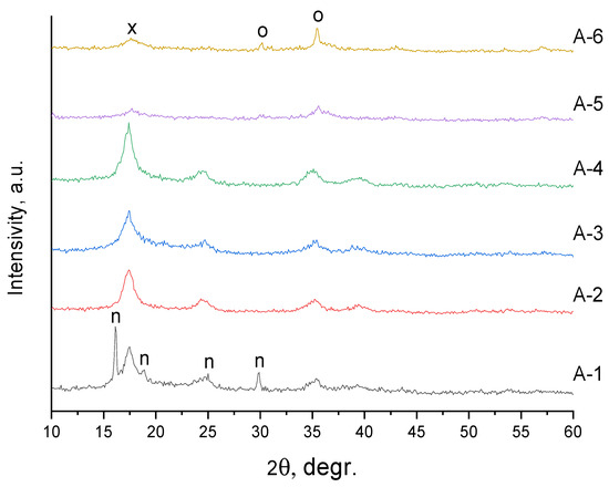 XRD patterns of DCS samples after plasma treatment but before thermal treatment. Phases notation: o—(Co0.22Fe0.78)(Co0.98Fe1.02)O3.965 (PDF Card—01-083-6174), n—Co(NH3)6·Fe(CN)6 (PDFCard—01-080-8908), and x—a mixture of Fe4(Fe(CN)6)3·14H2O (PDF Card—01-073-0689), Co3(Co(CN)6)2·xH2O (PDF Card—00-022-0215) and Fe0.667Co(CN)4·4H2O (PDF Card—04-013-6956).