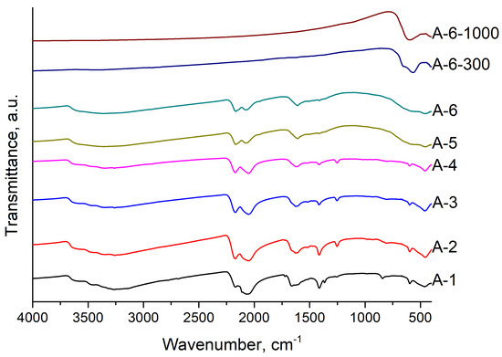 Elemental analysis showed the absence of nitrogen and hydrogen in the composition of sample A-6-1000; therefore, coordinated ammonia was completely removed as a result of plasma + thermolysis treatment. The carbon content is 0.9 ± 0.1 wt%, which indicates that 4.7% of the original carbon content, which is part of the cyano groups, remained in the calcination residue in the DCS. The IR spectrum of the A6-1000 sample (Figure 7) showed the absence of absorption bands characteristic of ferrocyanides.