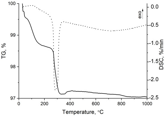 Synchronous thermal analysis (STA) was made using HQT-4 Henven (Beijing Henven Experimental Equipment, China, Beijing, 2022). Experiments were performed in an air atmosphere. The heating rate was 10 °C/min and the temperature range was 30–1000 °C. This analysis was carried out in an Al2O3 crucible without a lid. STA included thermogravimetry (TG) and differential scanning calorimetry (DSC) analyses.