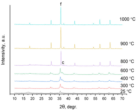 XRD patterns of DCS samples calcined at different temperatures. Phase designations: f—CoFe2O4 (PDF Card—04-016-3954), and c—Co3O4 (PDF Card—04-008-2376). An XRD pattern denoted as ‘25 °C’ corresponds to the initial compound (sample A-6).