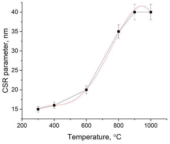 CSR parameter for DCS calcined at different temperatures. Black curve—experimental data. Red curve—a fitting curve. The fitting curve parameters are given in the text.
