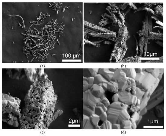 SEM images of the studied DCS thermal decomposition products with a spinel structure on a different scale: (a) 100 μm, (b) 10 μm, (c) 2 μm, (d) 1 μm.