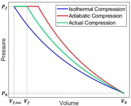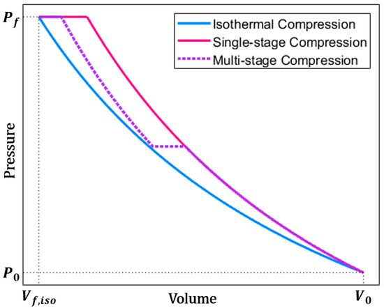 In addition to integrating heat transfer enhancement techniques, performing compression via a multi-stage system is key to increasing the system efficiency. Figure 1 displays pressure–volume trajectories of the isothermal, single-stage, and multi-stage compressions.