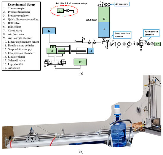 Figure 4 shows the schematic diagram and an actual picture of the experimental setup. A 2-foot-long polycarbonate cylinder serves as the compression chamber (part #2 of Figure 4a). Since the two ends are closed with aluminum plates and the starting water level is slightly above the floor of the chamber, the actual height occupied by the air is about 574.5 mm. On the top plate, a thermocouple (#1) and a pressure transducer (#2) are installed to measure the temperature and pressure of the air. A quick disconnect coupling (#4) is also located on the top plate. It functions as an outlet to the atmosphere by connecting a plug pipe and can be used as a path for air injection to set up a higher initial pressure by connecting to an air source. In this experimental setup, a soap solution served as the liquid in the liquid piston. This allows aqueous foam to be generated simply by blowing air through the bottom of the chamber. The soap solution was prepared by manually shaking water and a commercialized dishwashing-detergent. In this work, the primary goal is to observe general heat transfer trends at different pressures. Since the concentration of the solution is not a parameter of interest in this study, a random amount of the detergent sufficient to generate aqueous foam was used to make one batch of solution, which was used throughout the entire experiments without changing. Two double-acting cylinders (#11) worked as a water pump to carry out compression. The rod ends of the cylinders are coupled and move together, so that the retraction of one cylinder results in the extension of the other. The cylinder directly connected to the chamber is filled with liquid when it is extended. During the compression process, the extension of the other cylinder leads to the retraction of the cylinder connected to the chamber, which pushes the liquid into the chamber. Then, the air in the chamber is compressed. In order to measure the volume of air that is present in the chamber, a linear position sensor (#10) measures the position change in the rods of the cylinders (#11), which can be translated to the change in the liquid volume entering the chamber. Then, by subtracting the volume of the liquid entering the chamber from the initial volume of the air, the volume of the air in real time can be computed.