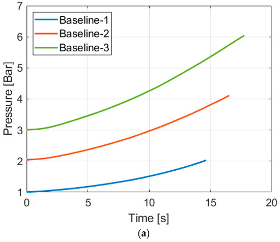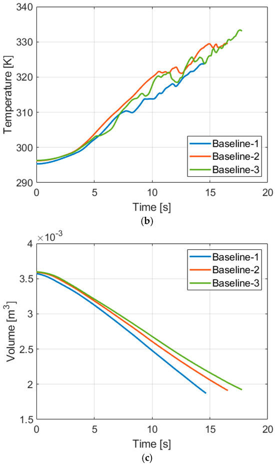 Figure 7a–c show the averaged pressure, temperature, and volume of Baseline-1, 2, and 3 up to the point where a pressure ratio of 2 is reached. Although the stroke time of each case was closely matched, the differences were inevitable due to the difficulties of the speed adjustment. A process with higher pressure takes a longer time to reach the pressure ratio of 2. A slow compression [26,49] is an advantageous condition for the isothermal performance. Therefore, if a process with a higher initial pressure is exposed to a more advantageous condition of a slow compression and still shows a lesser isothermal performance, it is safe to conclude that the process is less efficient than a process with a lower initial pressure. The influence of the initial pressure on isothermal performance can be compared with the temperatures presented in Figure 7b. The temperature increases in Baseline-1, Baseline-2, and Baseline-3 are 28.90 K, 33.32 K, and 36.75 K, respectively. This result agrees with the previous studies [34,48] as a higher initial pressure leads to a reduced isothermal performance.