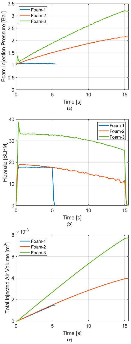 Figure 8 displays the properties of the air blown into the chamber to generate aqueous foam. The injection pressure, flowrate, and total volume of the injected air are presented in Figure 8a, b, and c, respectively. Figure 8a shows the pressure of the inlet air. For the pressure data, a pressure transducer was installed near the chamber inlet for the air-blowing source (sensor #2 beneath the chamber in Figure 4b system diagram). For Foam-1, because the chamber is open to the atmosphere, a minor increase in the inlet pressure is displayed, and it took only about five seconds to generate the intended amount of foam. For Foam-2 and 3, the air-blowing process was performed with the outlet closed to set up the initial pressure of 2 and 3 bars. Thus, continuous increase in the injection air pressure is shown, and the foam generation for Foam-2 and 3 took about 15 s. Figure 8b shows the flowrate of the blowing air, and Figure 8c shows the total volume of the injected air computed based on the flowrate.
