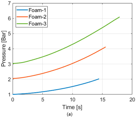 Compressions with aqueous foam were performed at 1 bar (Foam-1), 2 bars (Foam-2), and 3 bars (Foam-3), and the air properties of the processes are presented in Figure 9. The trends shown in the aqueous foam data observed in Figure 9 are similar to those of the baseline tests. It is observed that for a higher-pressure test, despite the slow compression, the temperature increases more than a lower-pressure test.