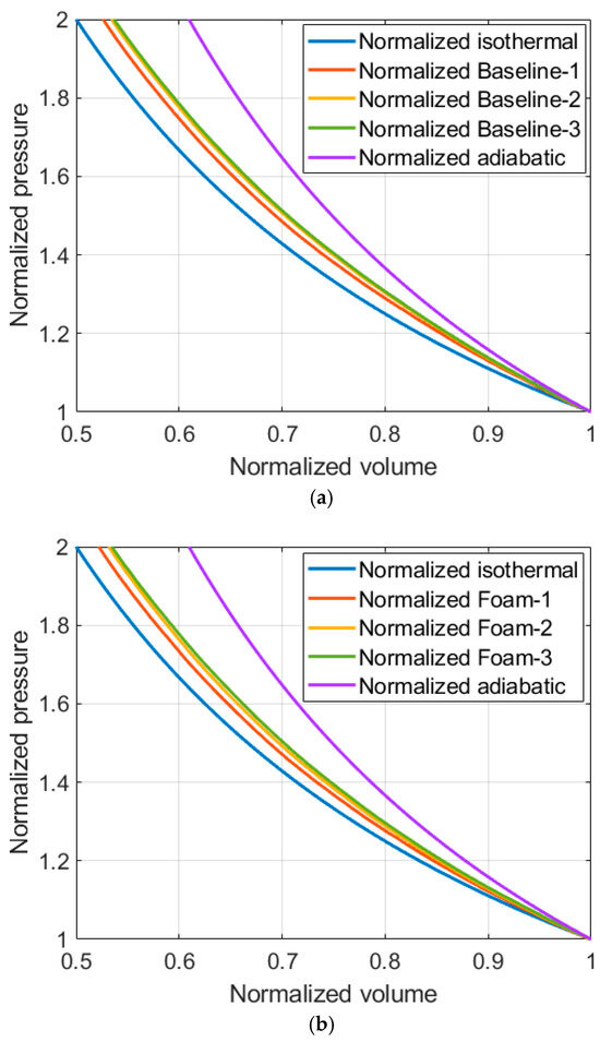 The normalized pressure–volume profiles of the tests are given in Figure 10. The profiles of the baseline experiments are presented in Figure 10a, and the foam experiments in Figure 10b. To normalize, the pressure and volume data were divided by the initial value of the properties. For both tests, the profile of a lower initial pressure is located closer to the isothermal profile. This means that the isothermal performance of a lower-pressure compression is more efficient than a higher-pressure compression.