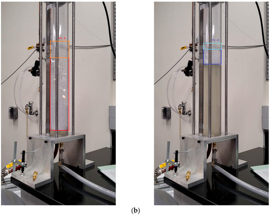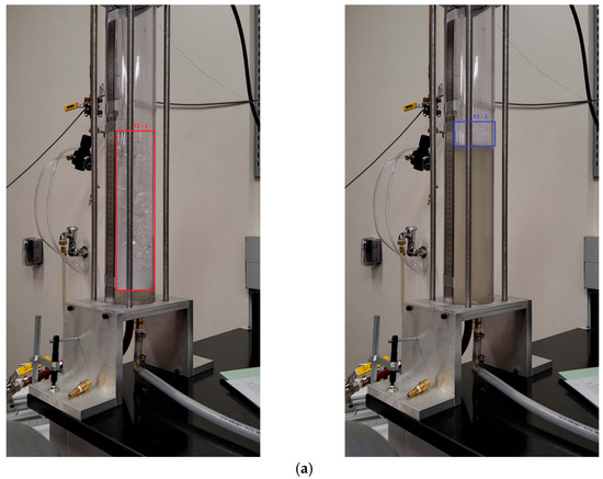 The foam layer height change is shown in Figure 11. The volume of the foam filling the chamber is one of the factors that determines the isothermal efficiency [36]. Hence, observing the foam layer height changes may assist with understanding the efficiency differentiation at different pressure levels. Figure 11a shows a typical foam height change. The picture on the left is a before-compression state, and the one on the right is the point where the pressure ratio of 2 was reached. It is also important to note that not all bubbles fully collapse during compression, and some portion of foam stays around for the next stroke. The residual bubbles are faint and look different than normal bubbles. The residual foam is marked with a lighter colored box and is shown in Figure 11b.