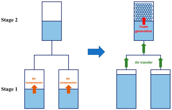 In this subsection, how aqueous foam can be employed in a multi-stage compression system is suggested in an energy-saving manner. Even though there is no additional work input while the process is ongoing, generating foam ahead of the start of the process requires work input. However, this work input can be saved in a multi-stage compression system, and this mechanism is schematically illustrated in Figure 12.