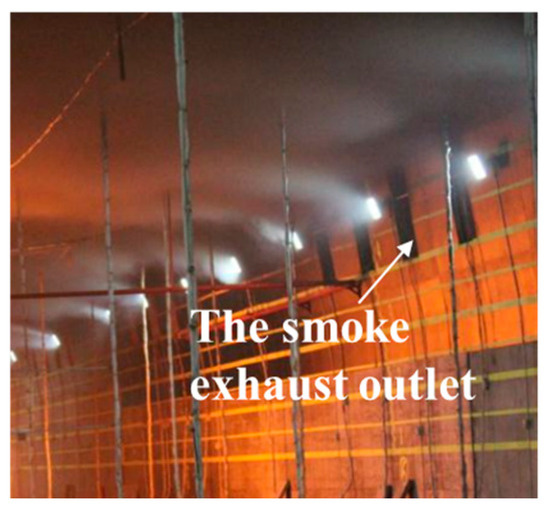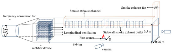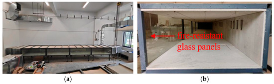 As shown in Figure 4a,b, the experiments were conducted using a 1:15 scaled tunnel model. The main structure of the model measures 6.64 m in length and 0.96 m in width, and is divided into four standard segments, each 1.66 m long. The lower part of the tunnel is supported by lockable pulley brackets, while the ceiling and floor are constructed using fire-resistant glass fiber boards mounted on steel frames. The tunnel wall without smoke exhaust vents is composed of 12 mm thick fire-resistant glass panels.