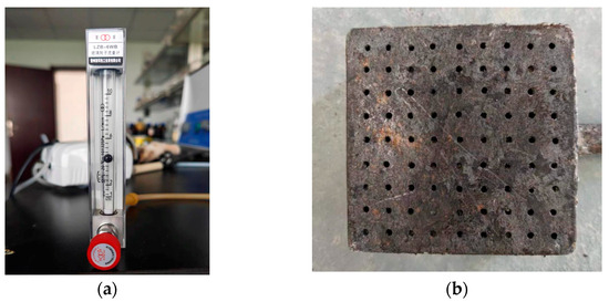 Propane was selected as the fuel for this experiment. It was stored in the cylinder in liquid form and regulated by a pressure-reducing valve to maintain a stable and safe supply. After pressure reduction, the propane entered a glass rotameter with a measuring range of 100–1000 L/h for precise flow control before being delivered to the burner. The burner consisted of a square porous plate measuring 10 cm × 10 cm, with 81 uniformly distributed orifices on its surface. Figure 5 presents the glass rotameter and the burner used in this study.