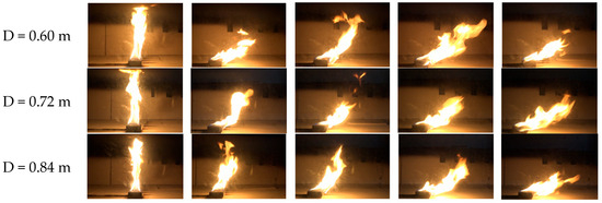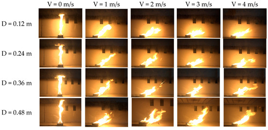 The distance between the fire source and the sidewall smoke exhaust outlet is defined as D. High-definition cameras were installed in front of and beside the fire source to capture and record the flame characteristics. The detailed setup of the experimental platform is presented in Figure 6. The specific experimental conditions are shown in Table 2 and Table 3.