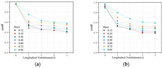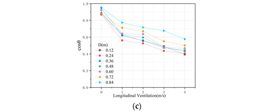 Figure 8 presents the variation in the cosine of the flame tilt angle (cos θ) as a function of the distance between the fire source and the sidewall smoke exhaust outlet under different longitudinal wind speeds. As shown in the figure, cos θ decreases progressively with increasing longitudinal wind speed, indicating that the flame tilt angle (θ) increases accordingly. The values of cos θ vary significantly with changes in the distance from the smoke exhaust sidewall, ranging from 0.40 to 0.96. In Figure 8a, corresponding to a heat release rate of 5.74 kW, the maximum value of cos θ is observed when the distance between the fire source and the sidewall exhaust outlet is 0.84 m. This corresponds to the smallest flame tilt angle among all tested positions. A general trend is evident: as the distance from the fire source to the sidewall exhaust outlet increases, cos θ increases, resulting in a smaller flame tilt angle θ. A similar trend is observed in Figure 8b for a heat release rate of 11.47 kW. Again, cos θ reaches its peak at a distance of 0.84 m, indicating the smallest tilt angle at this position. When the distance is less than or equal to 0.36 m, variations in flame tilt angle are minimal. However, greater changes in flame angle occur when the distance exceeds 0.48 m. In Figure 8c, at a heat release rate of 22.95 kW, the trend remains consistent. The maximum cos θ is again recorded at a distance of 0.84 m, corresponding to the smallest tilt angle. Notably, the difference in flame tilt angle between distances of 0.72 m and 0.84 m is relatively small. Overall, across all three heat release rates, the flame tilt angle was found to decrease (corresponding to an increase in cos θ) with increasing distance between the fire source and the sidewall exhaust outlet. Under the same longitudinal wind speed, variations in flame tilt angle are relatively small when the distance is ≤0.60 m, and become more pronounced when the distance is ≥0.72 m.