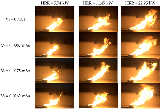 Figure 9 illustrates the variation in flame morphology under different sidewall smoke exhaust rates, with the fire source located along the tunnel centerline. The following observations can be drawn: (1) At a heat release rate of 5.74 kW, variations in the sidewall smoke exhaust rate have a negligible effect on the overall flame morphology. However, the flame exhibits a slight contraction, indicating limited sensitivity to exhaust flow at lower fire intensities. (2) At a heat release rate of 11.47 kW, the flame tilt angle gradually decreases with increasing sidewall smoke exhaust rate. The smallest tilt angle is observed at a smoke exhaust rate of 0.0349 m3/s, indicating that increased suction strength enhances the flame’s vertical stability. (3) At a heat release rate of 22.95 kW, the flame directly impinges on the tunnel ceiling and is positioned in front of the sidewall exhaust outlet. At lower exhaust rates (0, 0.0087 m3/s and 0.0175 m3/s), changes in the extraction rate exert minimal influence on flame morphology. However, at higher exhaust rates (0.0262 m3/s and 0.0349 m3/s), the enhanced suction effect pulls the flame closer to the sidewall, resulting in a reduced flame tilt angle. Although the primary function of sidewall smoke exhaust is to facilitate the rapid removal of toxic smoke, the induced suction flow can also alter flame trajectory, drawing it laterally toward the exhaust outlet. This deflection may influence the flame spread pattern and potentially cause localized temperature increases and instability in flame propagation direction within the tunnel.