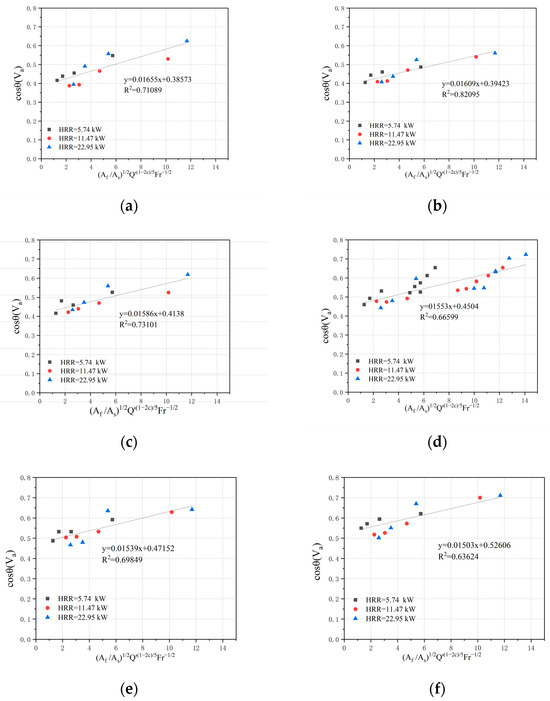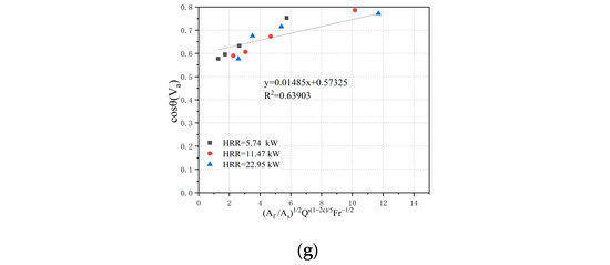 By substituting Equation (6) into Equation (4), a predictive model for the flame tilt angle is obtained, which explicitly incorporates the influence of the sidewall smoke exhaust rate: