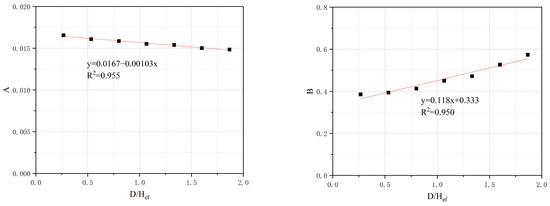 As shown in Figure 11, the fitting coefficient A decreases linearly with increasing D/Hef, while coefficient B exhibits a linear increase. Through linear regression analysis of the dimensionless distance D/Hef, the expressions for coefficients A and B are given as follows: