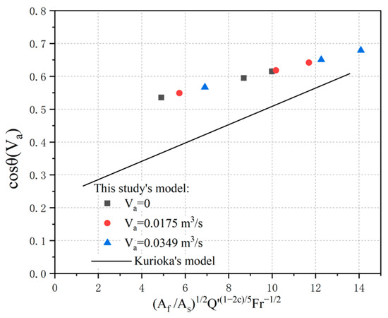 Figure 12 compares the predictive model developed in this study—considering a fire source located at the tunnel centerline under varying sidewall exhaust rates—with the model proposed by Kurioka et al. The results indicate that the predicted cos θ values from the present model are consistently higher than those derived from Kurioka’s model, corresponding to smaller flame tilt angles θ. This discrepancy arises because the sidewall exhaust reduces the effective longitudinal velocity near the fire source, which in turn exerts a reduced inertial force on the flame, leading to a decrease in the tilt angle.