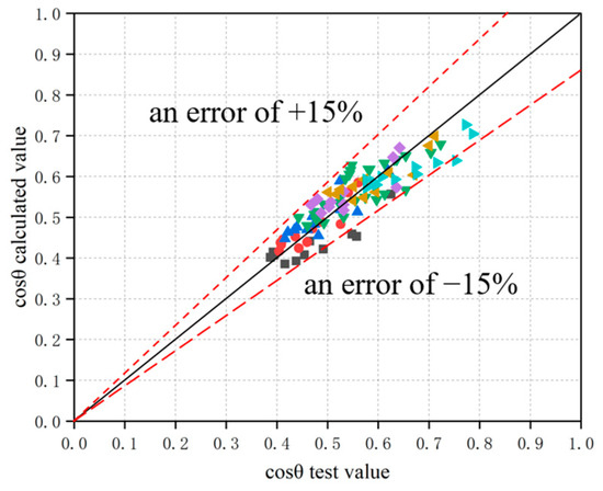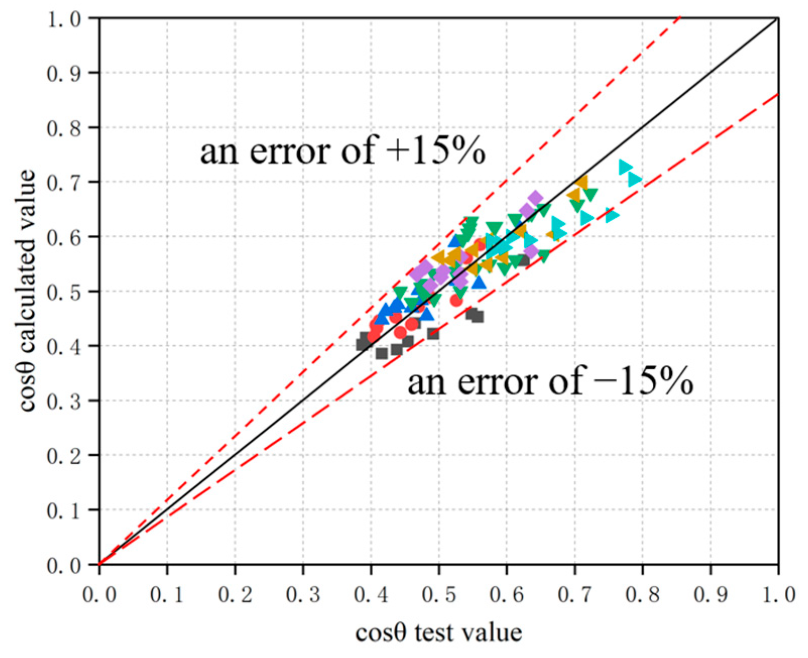 Figure 13 depicts a comparison between experimental and calculated values derived from Equation (12). The predicted values obtained from Equation (12) show good agreement with the experimental measurements. These results confirm that Equation (12) can reliably predict the flame tilt angle under longitudinal ventilation conditions for varying distances between the fire source and the sidewall exhaust outlet.