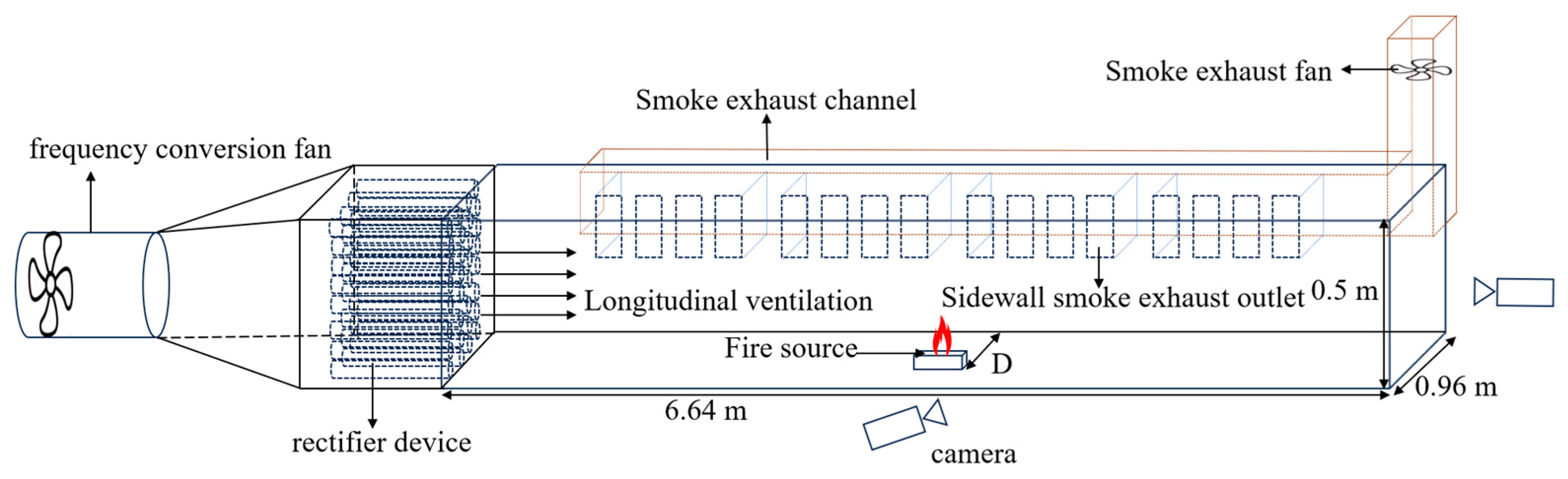 The distance between the fire source and the sidewall smoke exhaust outlet is defined as D. High-definition cameras were installed in front of and beside the fire source to capture and record the flame characteristics. The detailed setup of the experimental platform is presented in