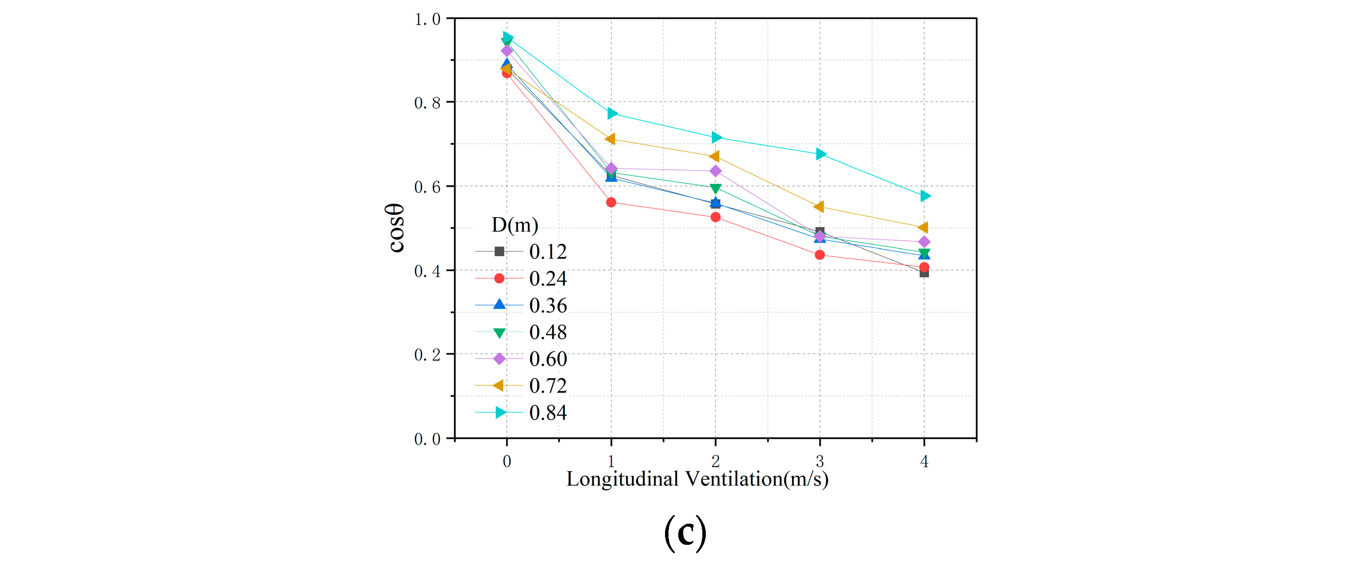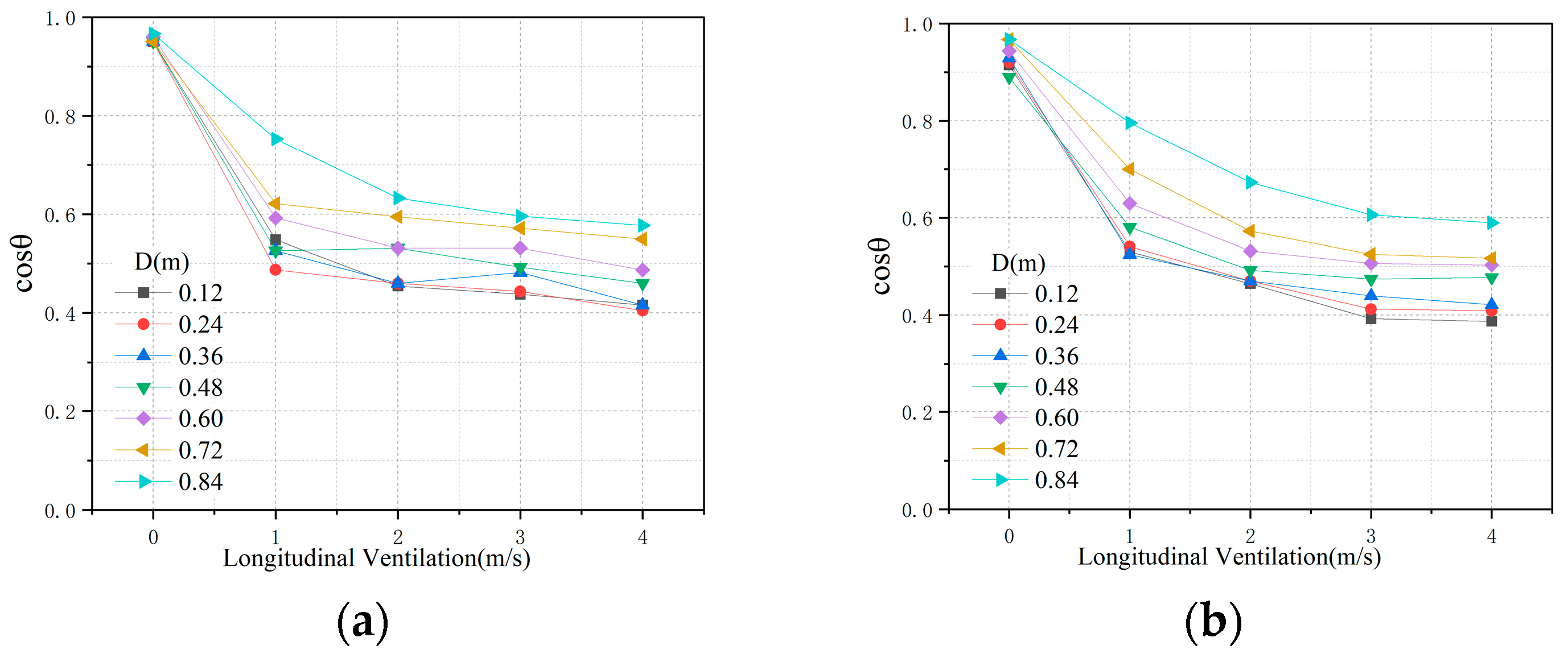 Figure 8c, at a heat release rate of 22.95 kW, the trend remains consistent. The maximum cos θ is again recorded at a distance of 0.84 m, corresponding to the smallest tilt angle. Notably, the difference in flame tilt angle between distances of 0.72 m and 0.84 m is relatively small. Overall, across all three heat release rates, the flame tilt angle was found to decrease (corresponding to an increase in cos θ) with increasing distance between the fire source and the sidewall exhaust outlet. Under the same longitudinal wind speed, variations in flame tilt angle are relatively small when the distance is ≤0.60 m, and become more pronounced when the distance is ≥0.72 m.