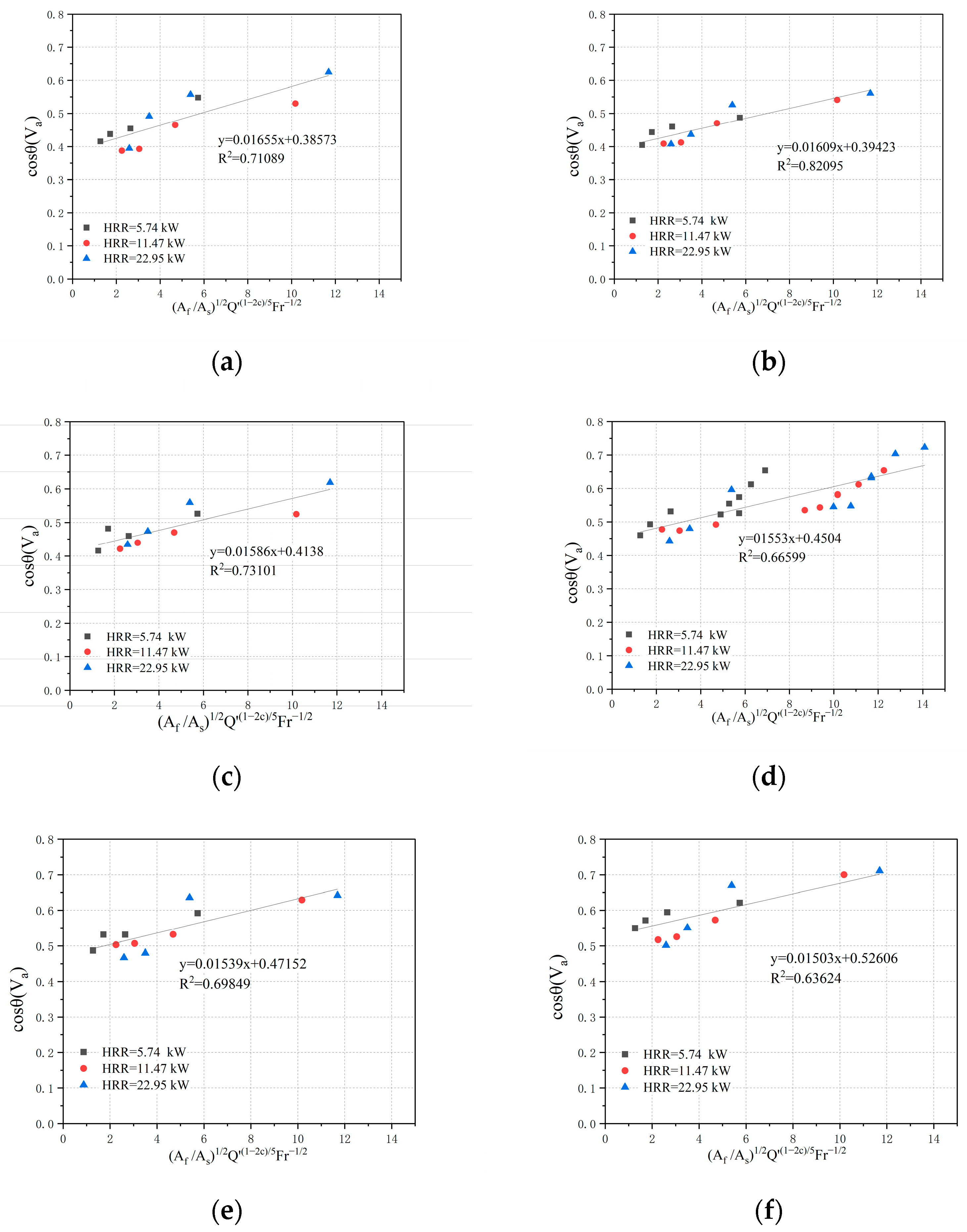 Figure 8a, corresponding to a heat release rate of 5.74 kW, the maximum value of cos θ is observed when the distance between the fire source and the sidewall exhaust outlet is 0.84 m. This corresponds to the smallest flame tilt angle among all tested positions. A general trend is evident: as the distance from the fire source to the sidewall exhaust outlet increases, cos θ increases, resulting in a smaller flame tilt angle θ. A similar trend is observed in