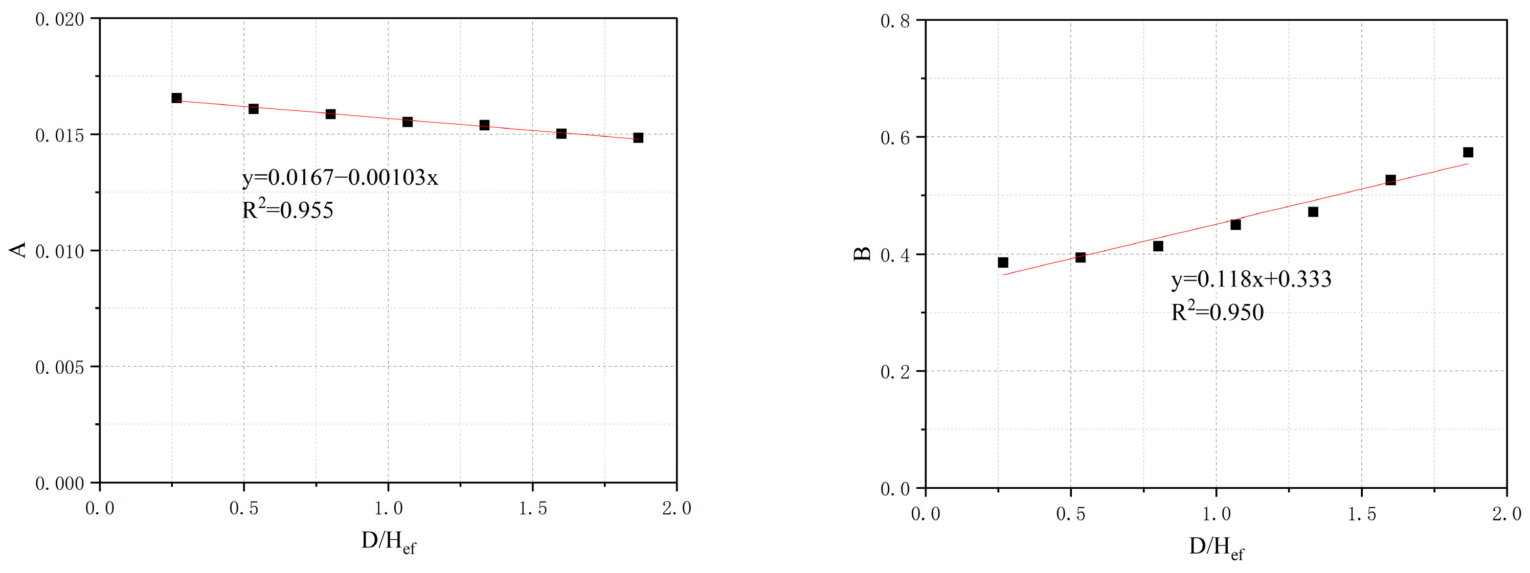 Figure 11, the fitting coefficient A decreases linearly with increasing D/Hef, while coefficient B exhibits a linear increase. Through linear regression analysis of the dimensionless distance D/Hef, the expressions for coefficients A and B are given as follows: