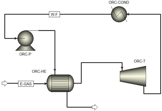 For the ORC, the NIST Reference Fluid Thermodynamic and Transfer Properties (REFPROPs) platform was used. The ORC process consists of a pump, an evaporator, a condenser, and a turbine; the ORC flowsheet is shown in Figure 2. The parameters of each equipment unit and the conditions for each working fluid were also taken from the work by Kajurek et al. [43]. For the ORC simulation, the condensation temperature was fixed at 30 °C with an evaporation temperature of 80 °C, as suggested by Kajurek et al. [43]. The ORC was simulated first for each working fluid to deliver 1 MW of production power. The main parameters for the simulation of the integrated BGCC-ORC system are reported in Table 1.