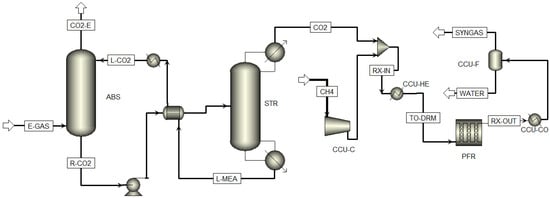 Figure 3 shows the flowsheet of the CCU process to produce syngas by dry reforming of methane (DRM) based on carbon. For the simulation of the carbon capture process, the kinetic model of Zhang et al. based on experimental data [45] and the NRTL thermodynamic model were used. In the process, the stream of combustion gases (E-GAS) is fed to an absorber (ABS) where 90% of the carbon is captured using a monoethanolamide (MEA) solution as absorbent (35 wt%). Then, the stream from the absorber (R-CO2) is heated and fed to a stripping unit (STR). Finally, the CO2 stream with a carbon molar concentration of 98% is obtained in the STR dome, and a stream that recovers MEA (L-MEA) exits as a bottom product, which is recirculated to the absorber.