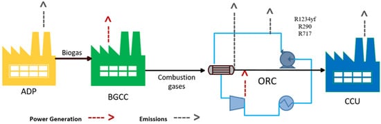 The analysis considers the life cycle scheme shown in Figure 4, which includes the biogas production in addition to the BGCC power plant, the ORC process, and the CCU technology. Data of emission for the biogas production process were taken from the Ecoinvent database for an anaerobic digestion plant [48], and those for the BGCC power plant and the CCU were estimated via simulations. For the ORC, two percent yearly losses of the working fluid were set, as reported by Gerber and Maréchal [49]. Values of equivalent carbon grams for greenhouse gases were taken from the IPCC report [50].