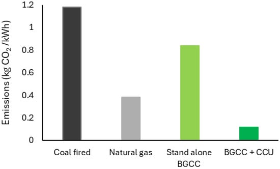 For the stand-alone BGCC power plant, an amount of 39.92 kt/year of carbon emissions was obtained from the Aspen simulations, which corresponds to a value of 0.838 CO2 kg/kWh. Comparison with conventional technologies showed that such emissions are 119% higher than those obtained from a combined cycle power plant operating with natural gas and 28.9% lower than those from a coal-fired power plant. The higher value of emissions for the BGCC compared with the natural gas power plant is due to the biogas composition; however, such emissions are considered with negative values in a life cycle calculation like the one carried out here because of their non-fossil nature. As a result, the implementation of a carbon capture technology at the BGCC power plant can significantly reduce direct air emissions compared with conventional processes, as shown in Figure 6.