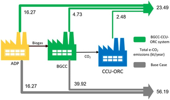 Figure 7 shows the emissions from the system as estimated by Aspen Plus simulations for the base case and the integrated BGCC-CCU-ORC system. One can observe that e-CO2 emissions are reduced from 39.92 kt/year based on the BGCC single unit to 7.21 kt/year for the integrated system (equivalent to an 82% reduction). If one considers a life cycle analysis, the ADP unit that produces the biogas fed into the system needs to be added. The ADP component produces 16.27 kt/year of e-CO2 emissions. The savings provided by the integration of the BGCC-CCU-ORC system amount to 32.7 kt/year, or 58.2%, with respect to the ADP-BGCC system. It should be noted that the annual leaks assumed in the ORC result in a minor environmental impact because of the low flow and GWP of the working fluids.