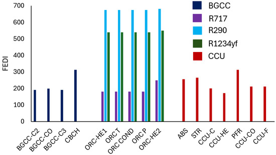 FEDI values for each section unit of the integrated system and working fluid.