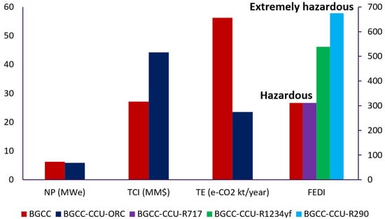 Figure 9 shows a summary of the metrics evaluated in this work. As can be observed, the proposed system can achieve significant social, environmental, and economic benefits due to the combination of key technologies that take advantage of the use of resources such as bio-waste materials and biogas. The resulting structure can produce electricity and syngas with a reduction of 58.2% of e-CO2 emissions (CCU technology), without increasing the risk classification of the process with the R-717 ORC working fluid and reducing CUU energy penalty with the use of waste heat as an energy resource that contributes to the reduction in the process energy requirements. The R-717 working fluid turned out to be the best selection from the three options considered in this work because it has the lowest values of latent heat of vaporization, heat of combustion, and NFPA flammability.
