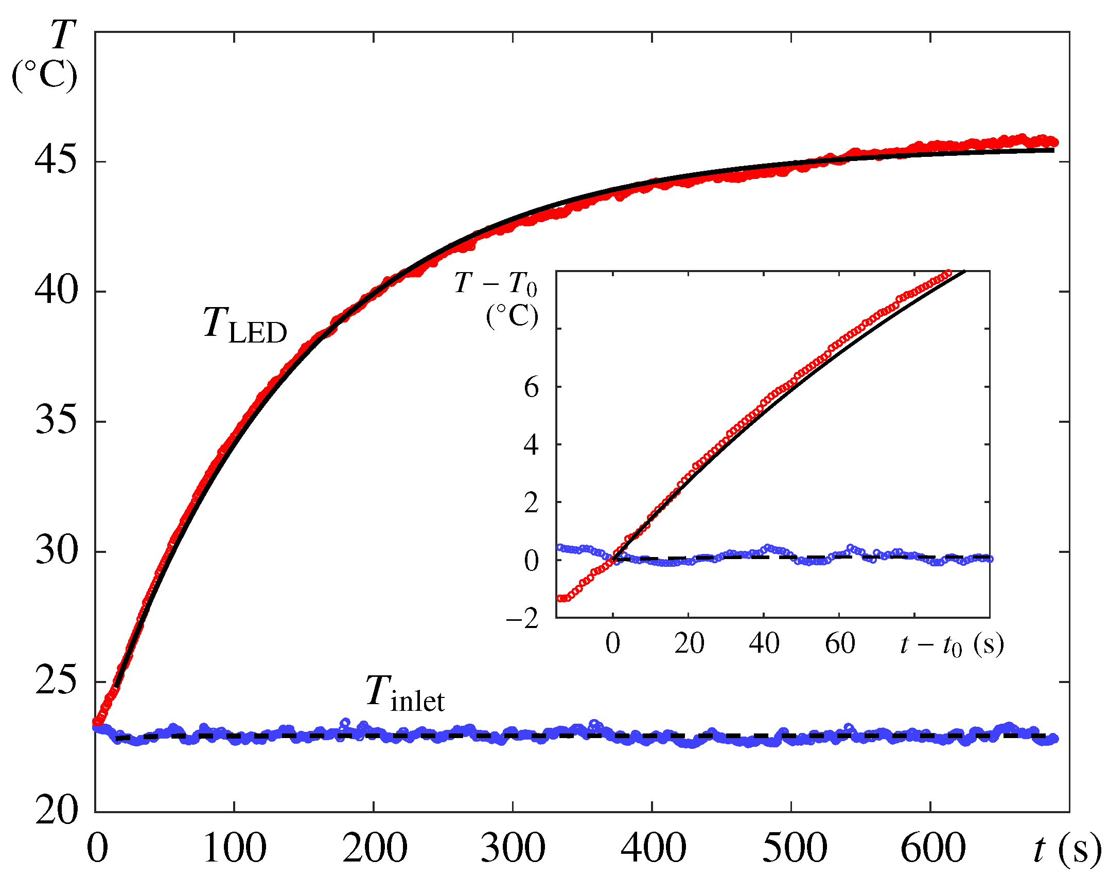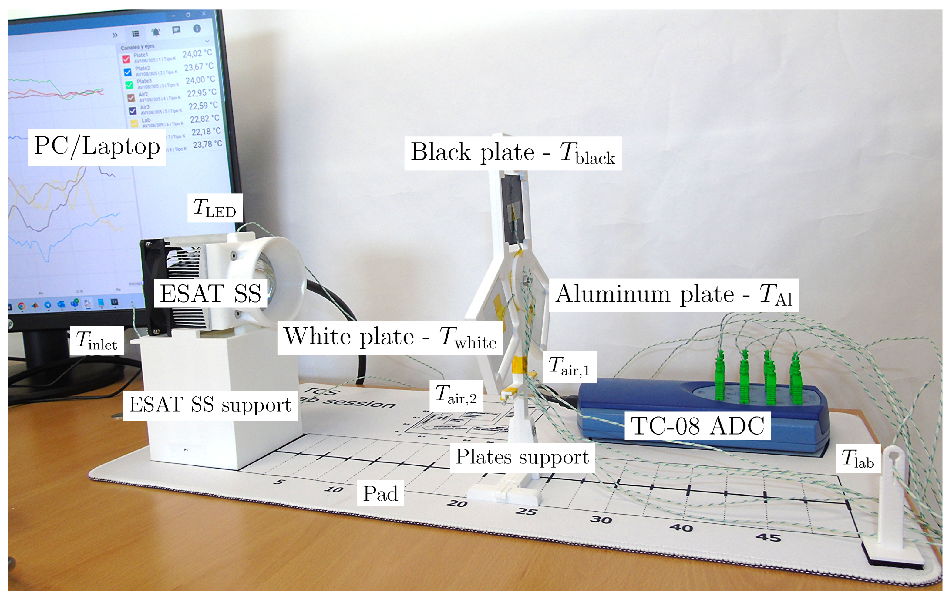 - (30 min) Thermal characterization of ESAT Sun simulator:Thermocouples will be used to measure the temperature evolution of the ESAT Sun simulator and inlet air of the cooling fan. These data allow estimation of the steady-state temperature of the LED and the heat transfer coefficient that characterizes the convective cooling of the LED–fan system. In the remainder of the session, the characteristic steady-state temperature of the light source will be used as a reference to monitor its adequate functioning.