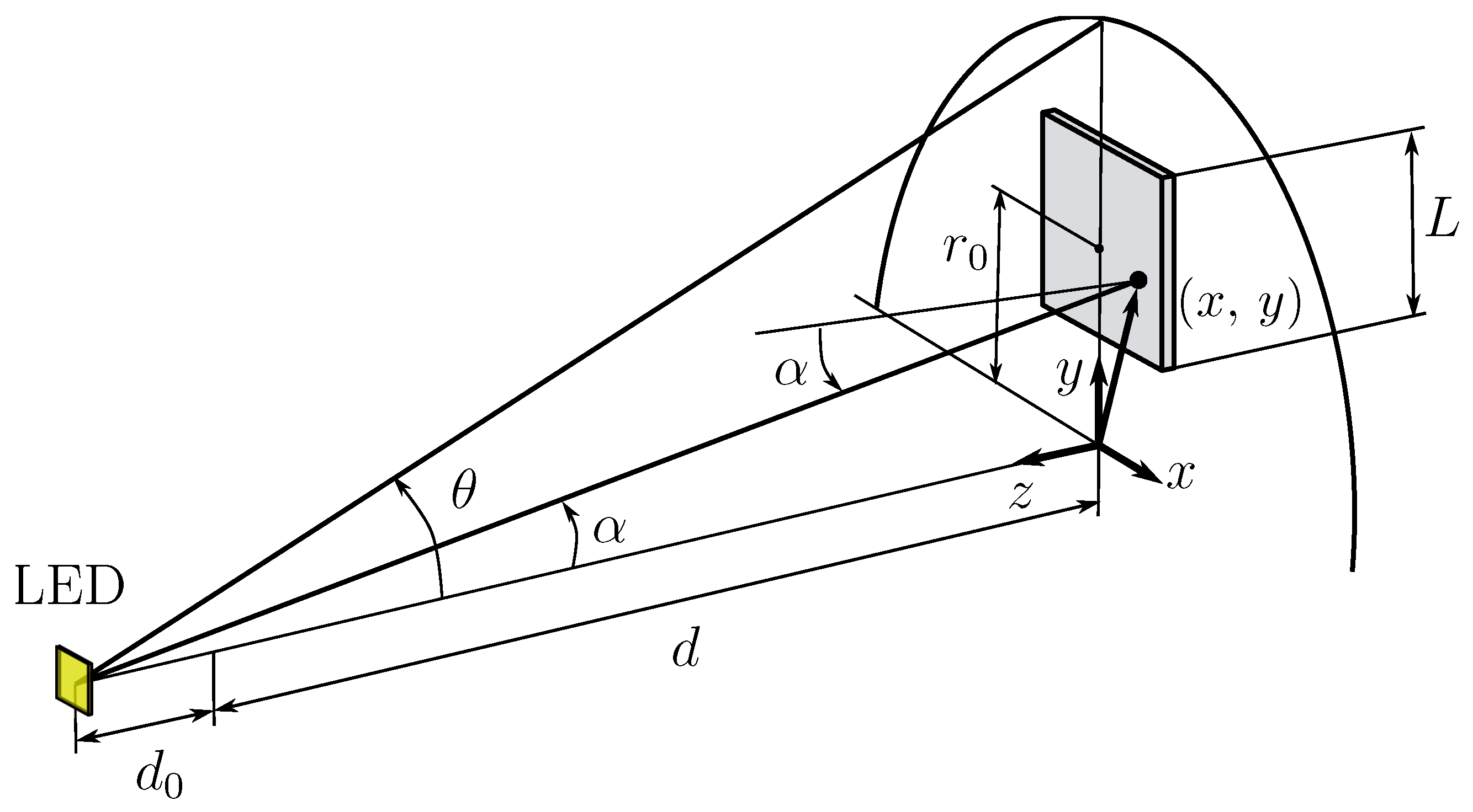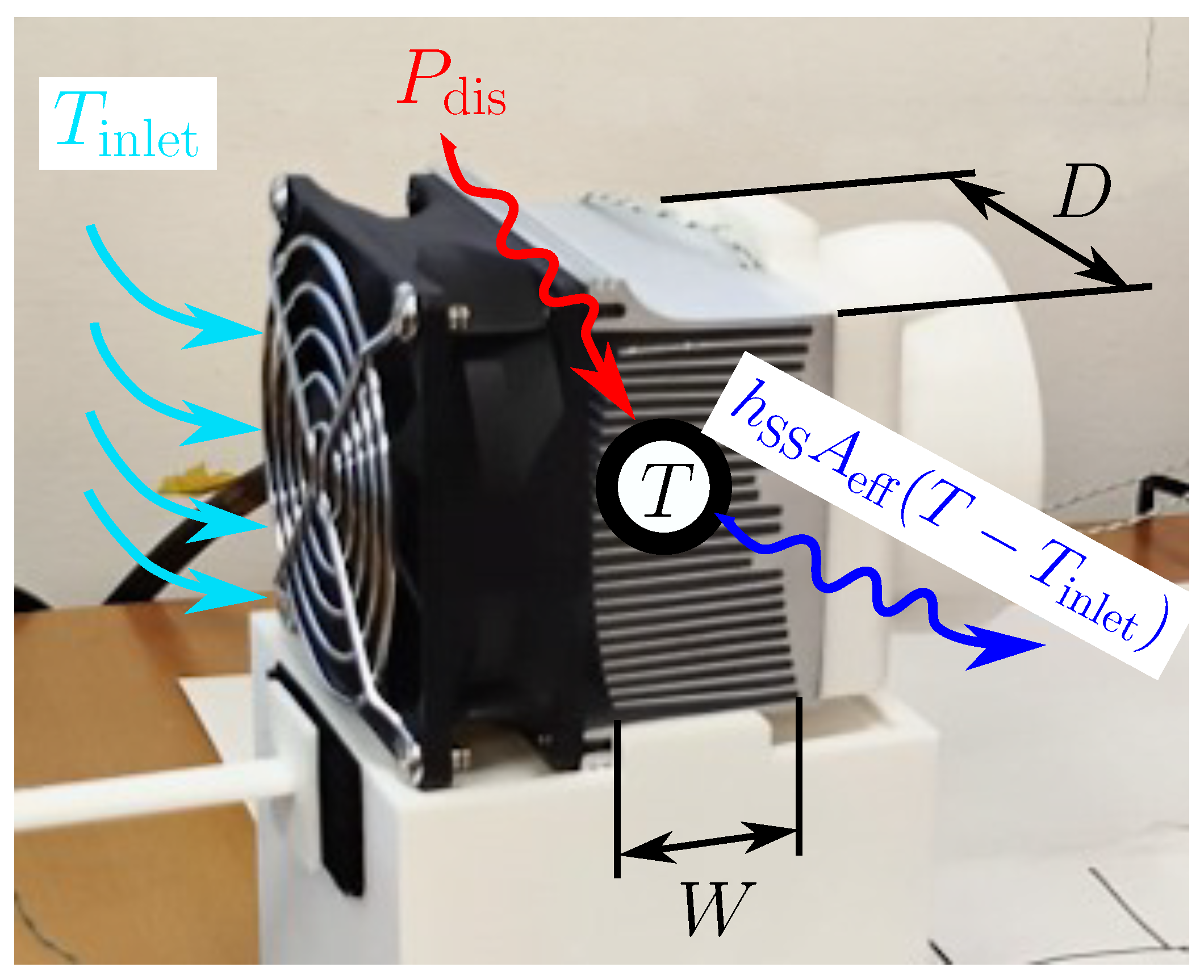 - Convective exchange with the surrounding air:As in the case of the ESAT Sun simulator, the plate exchanges heat with the surrounding air along its front and rear surfaces. Using Newton’s law of cooling, this heat can be written aswhere is the convective heat transfer coefficient and is the temperature of the air. In Section 4.4, we describe the estimate of , based on empirical correlations. These correlations already account for the conductive heat exchange with the surrounding air.Note that the effect of the air flow generated by the LED fan on the air surrounding the plates is neglected. This is justified by the fact that fan-driven convection flow exits the dissipator laterally, i.e., horizontally and parallel to the plane of the plates. Furthermore, the minimum distance between the plates and the ESAT light source is cm (see Section 4.3), while the characteristic viscous length is . For the air flow in the fan, we estimate cm, which is several orders of magnitude smaller than ; see Section 2.