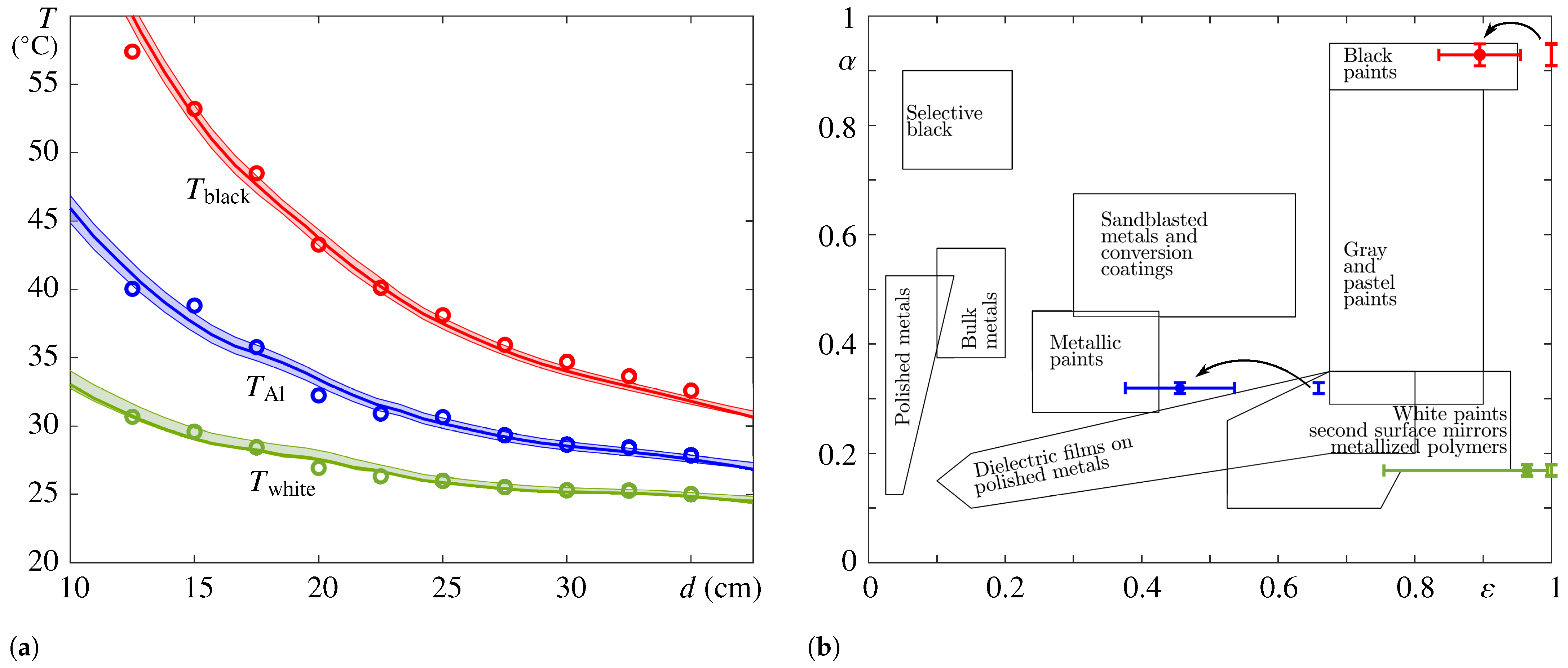 - Henninger, J. Solar Absorptance and Thermal Emittance of Some Common Spacecraft Thermal Control Coatings; Technical Report NASA-RP-1121; National Aeronautics and Space Administration: Washington, DC, USA, 1984. [Google Scholar]