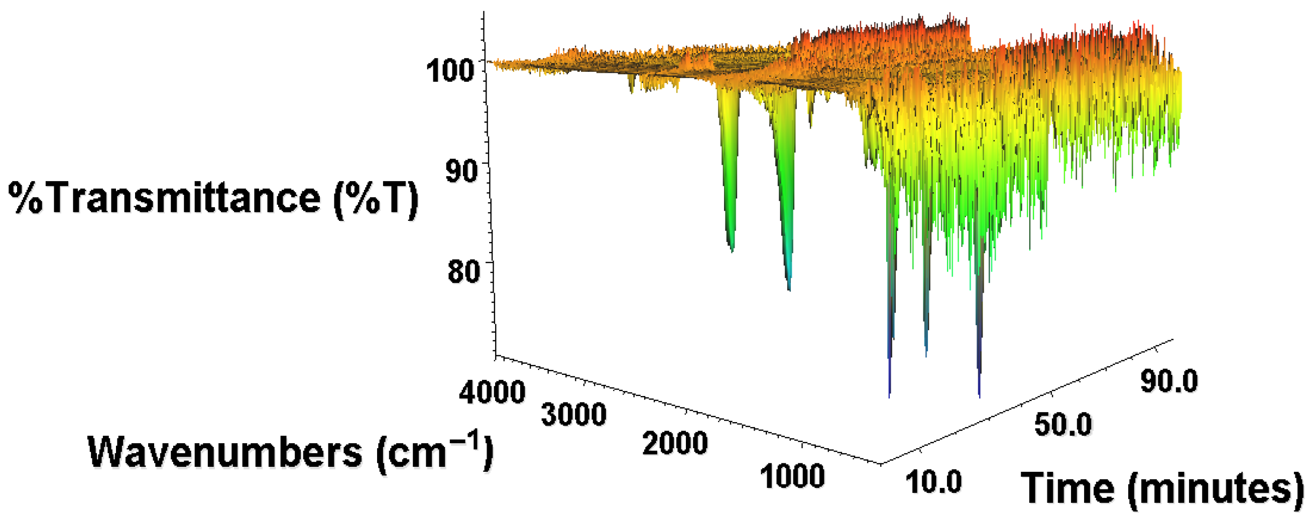 - By operating a synchronous thermal analysis device with IR analysis of the gas phase, thermogravimetric data and an array of IR spectrometric data in .srs format were obtained (see Figure 1). The data array is obtained in the form of a three-dimensional diagram. Coordinates of diagram: time, transmittance, and wavenumber (λ).