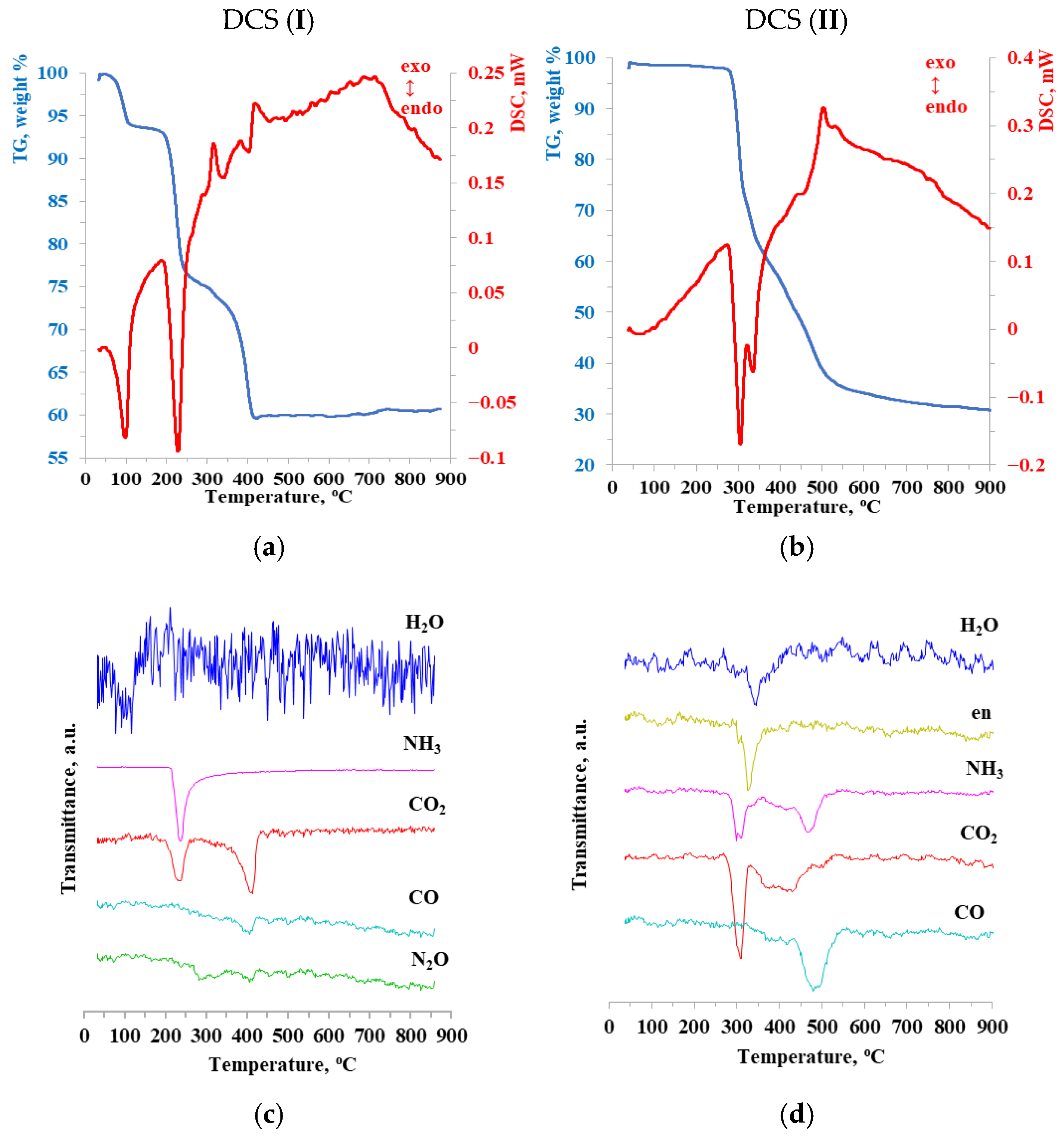 - Domonov, D.P.; Pechenyuk, S.I.; Semushina, Y.P.; Kadyrova, G.I. Solid-state transformations by thermal decomposition of [Co(en)3][Fe(C2O4)3] in an inert atmosphere. Thermochim. Acta 2020, 687, 178578. [Google Scholar] [CrossRef]
