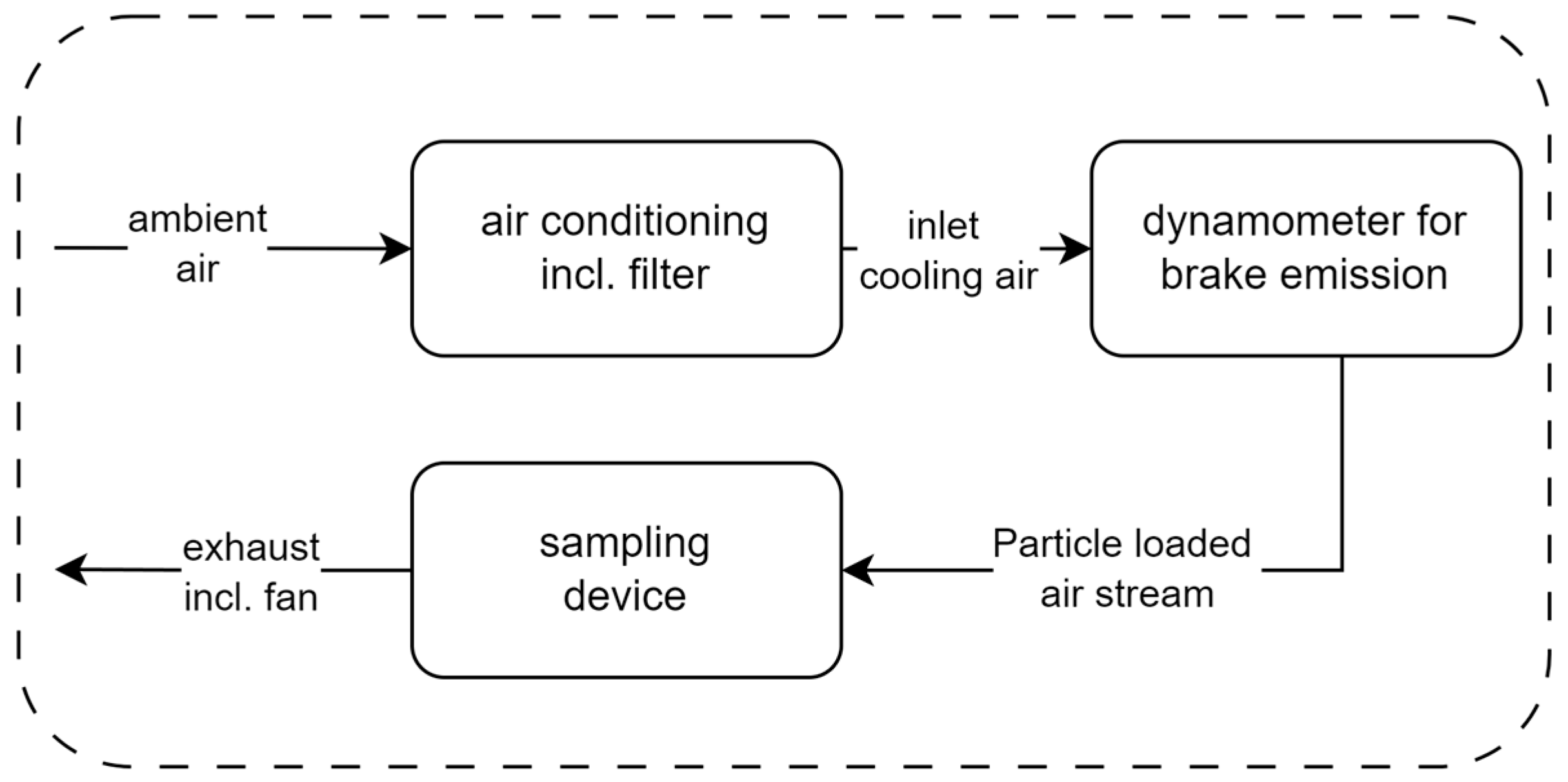 - Huber, M.P.; Fischer, P.; Mamakos, A.; Steiner, G.; Klug, A. Measuring Brake Wear Particles with a Real-Driving Emissions Sampling System on a Brake Dynamometer. In SAE Technical Papers; SAE International: Warrendale, PA, USA, 2022. [Google Scholar]