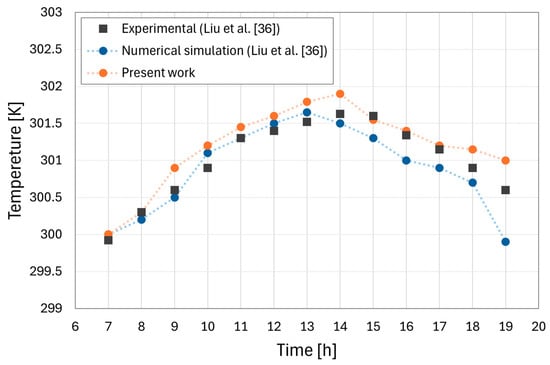 To validate the introduction of blinds into the model, a building located in Tianjin, China, was simulated, using the experimental and numerical results from Liu et al. [] for contrast. The evolution of indoor air temperature of the building with blinds during summer solstice is presented in Figure 5, where it may be observed that the present work follows the evolution of the experimental results with great accuracy, even higher than the original numerical results at some daytimes. Statistical validation yielded RMSE = 0.40 °C, NMBE = +0.13%, and R2 = 0.991. These indicators demonstrate an excellent level of agreement, confirming that the model reliably reproduces the experimental thermal response under the specified boundary conditions.
