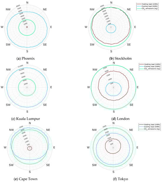 Annual cooling and heating loads and CO2 emissions by orientation for the six representative cities.